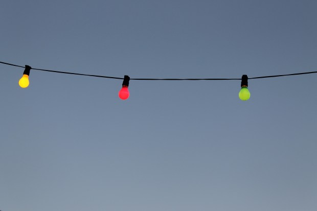 Light bulbs later on against the sky.