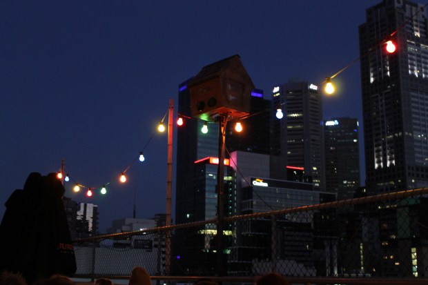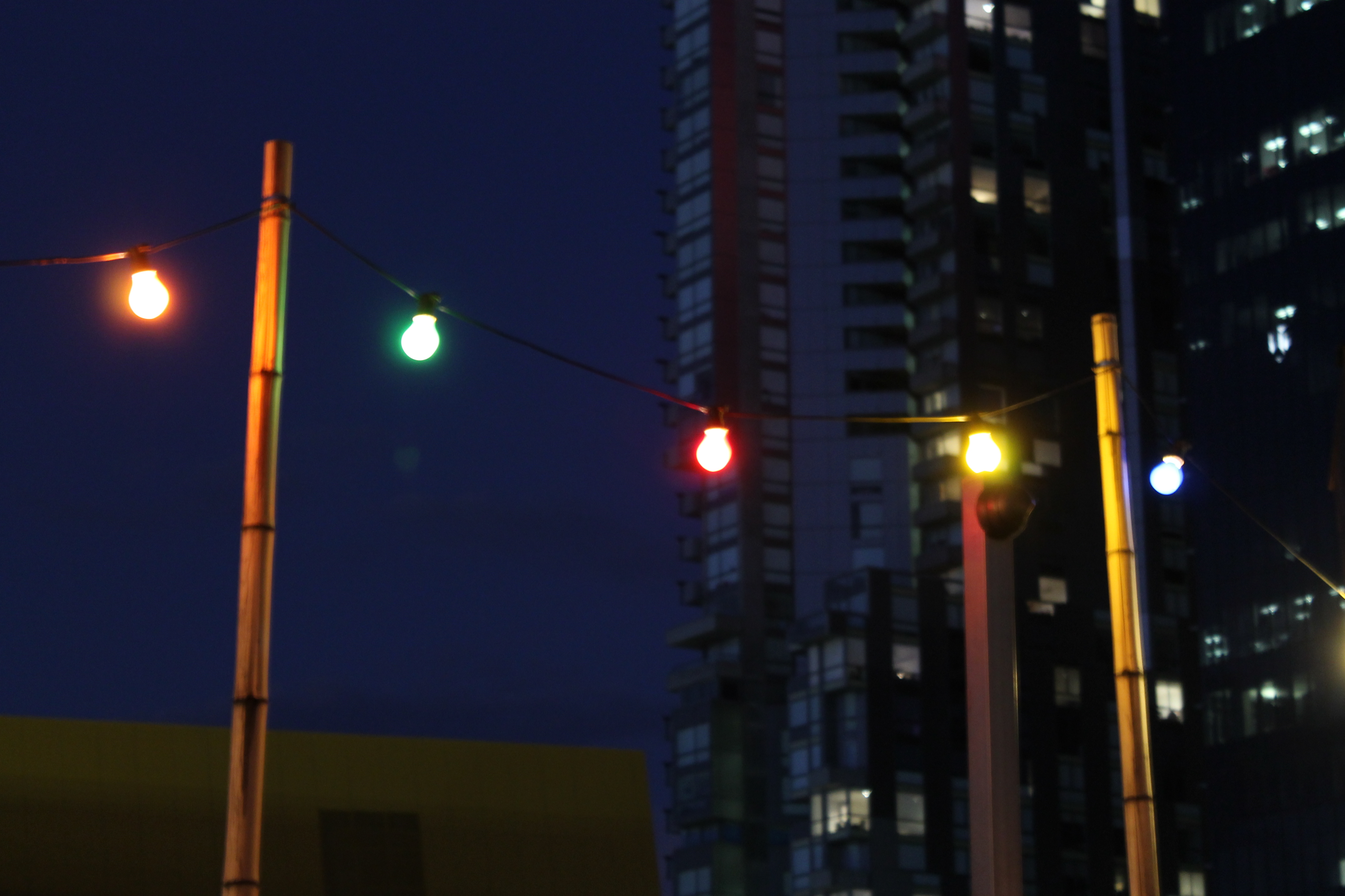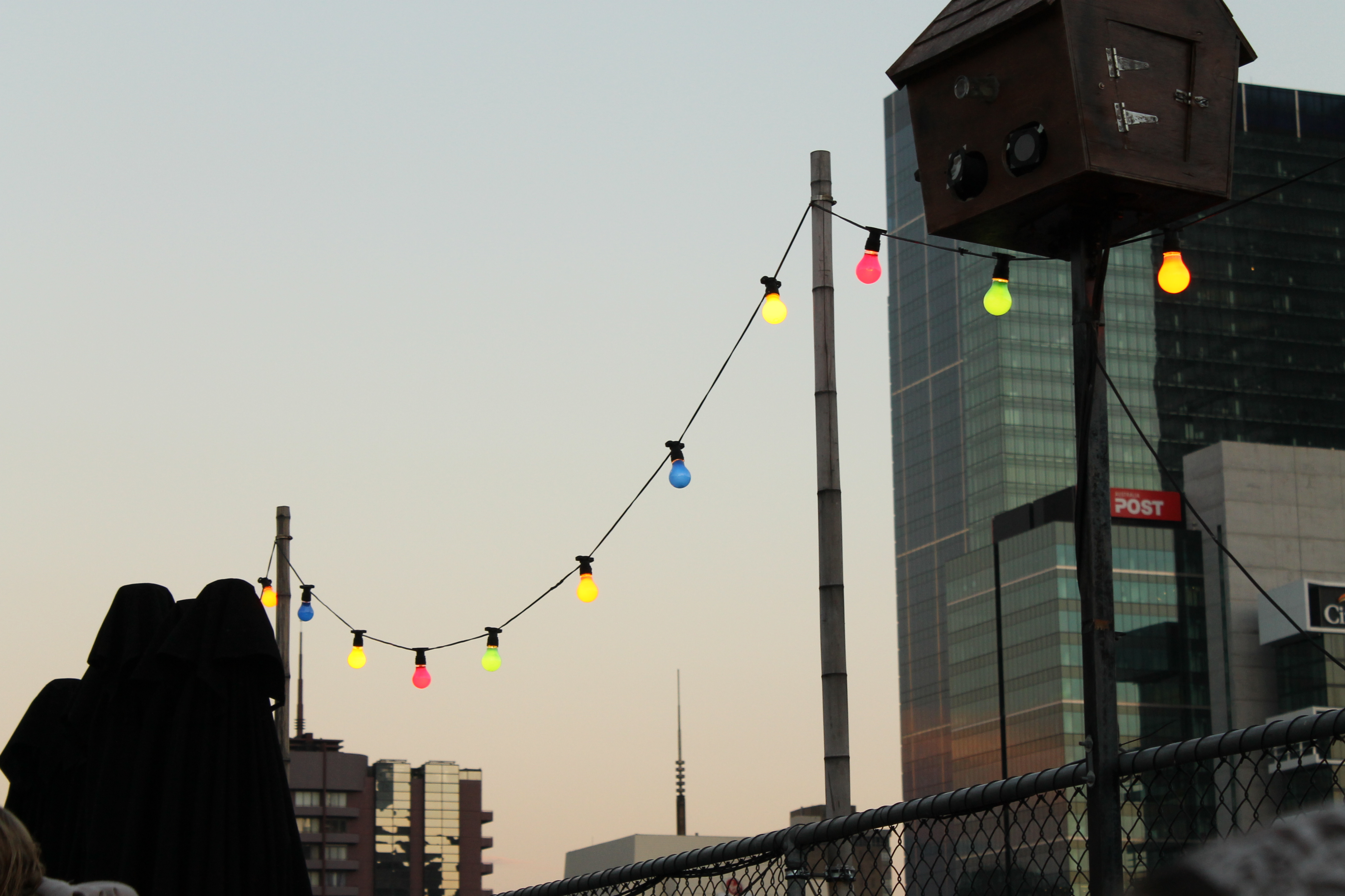 Last night I went to the Rooftop Cinema at Curtin House in central Melbourne, we saw “We need to talk about Kevin” – the film was amazing but can be best described as mind-breaking. The Rooftop Cinema has quite a unique décor with coloured light bulbs strung up around the edges. I watched as the sunset and the light bulbs became brighter against the darkening night sky. I must have taken 50 shots from my chair as we waited for the film to start, now that I know a bit more about the settings etc on the camera I took lots of subtly different versions of the same thing.