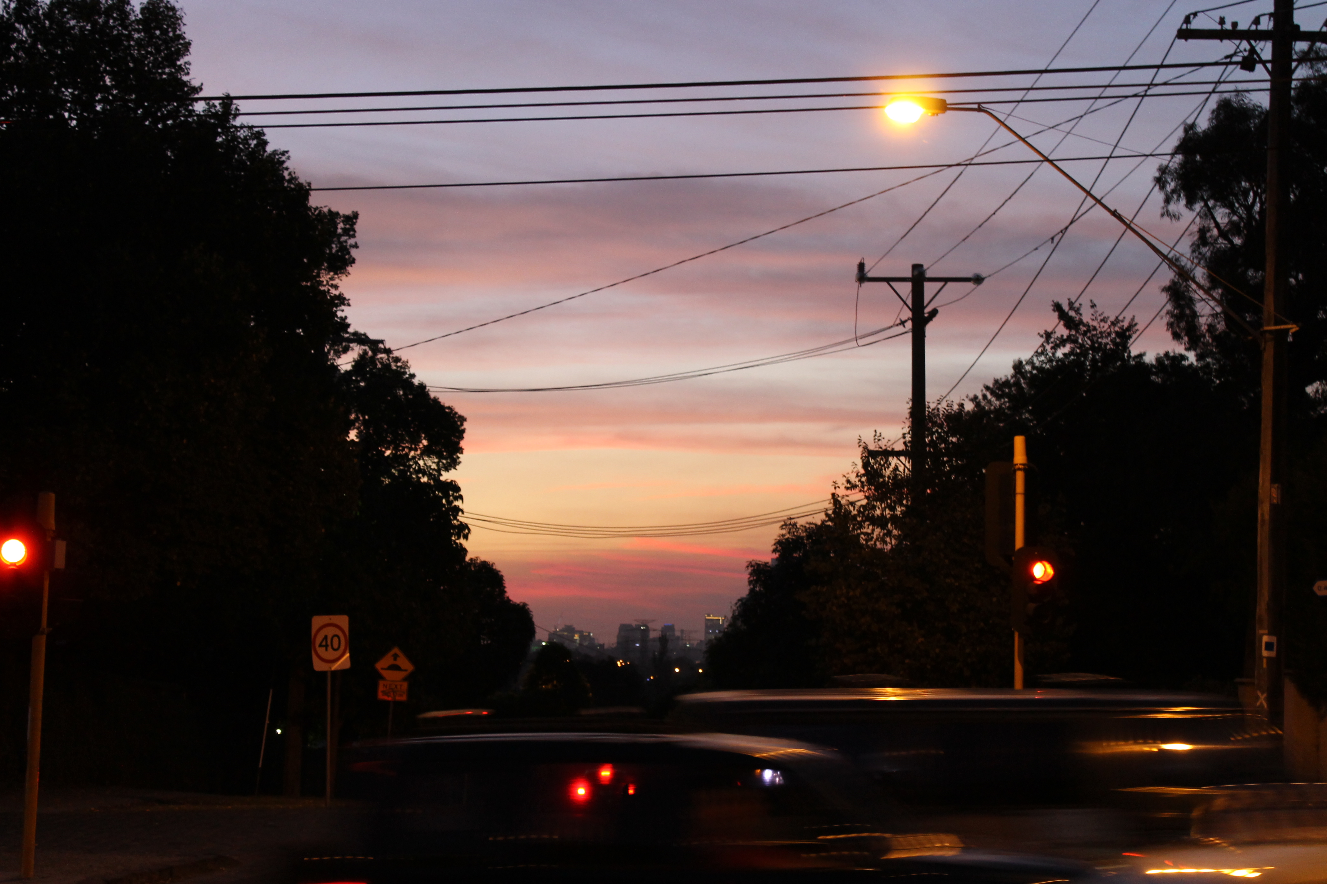 This one is looking down a hill across a busy street. You can see here the gradation of the sky, and the pink over the city in the distance. I also like how warm the street lamp is in this shot.