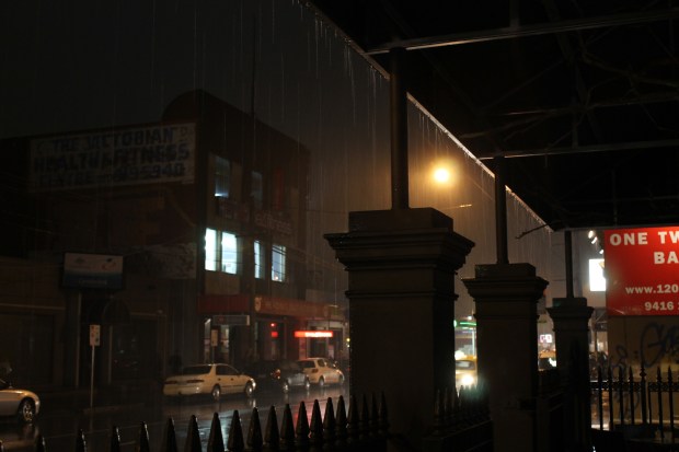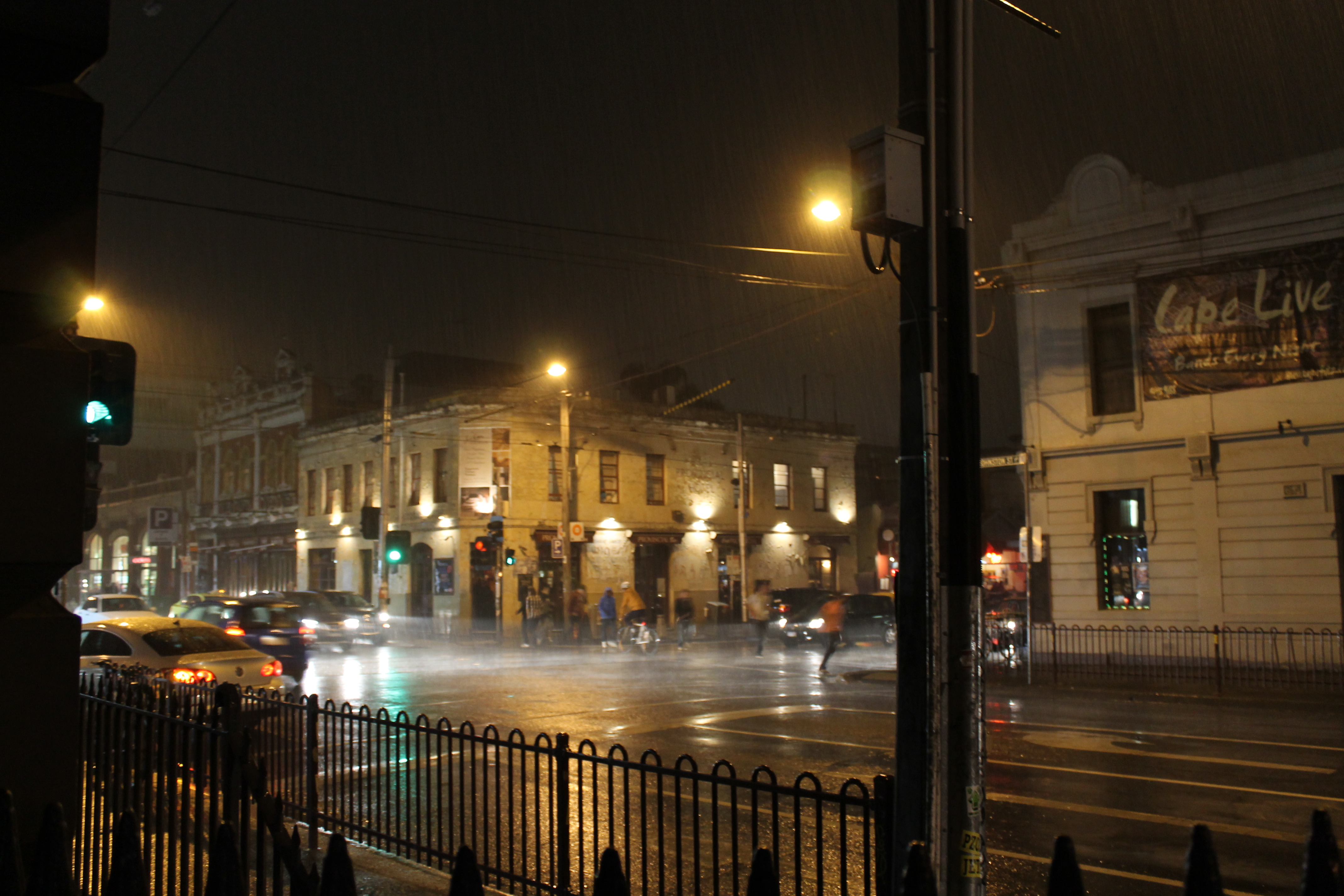 Here I was trying to get the ribbons of rain coming off the awning; note the beautiful wrought iron fence and graffiti typical of Fitzroy.