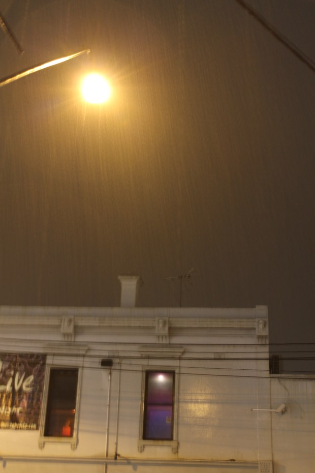 We decided to sit outside and not long after we sat down it started to rain. It was the first time I’ve had an opportunity to take photographs of rain at night, and I tried to get some representative ones: