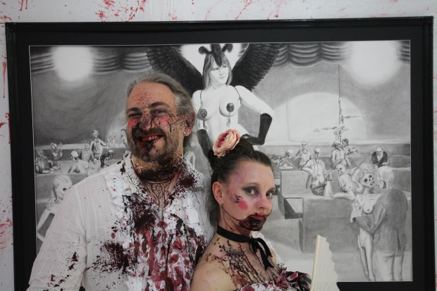 Also, here is a picture of my friends Jonathan and Gabrielle as zombies at a gallery opening I went to last week. The picture in the background was done by Jonathan and is for sale, so if you want it let me know, and this was taken with the new wide angle lens.