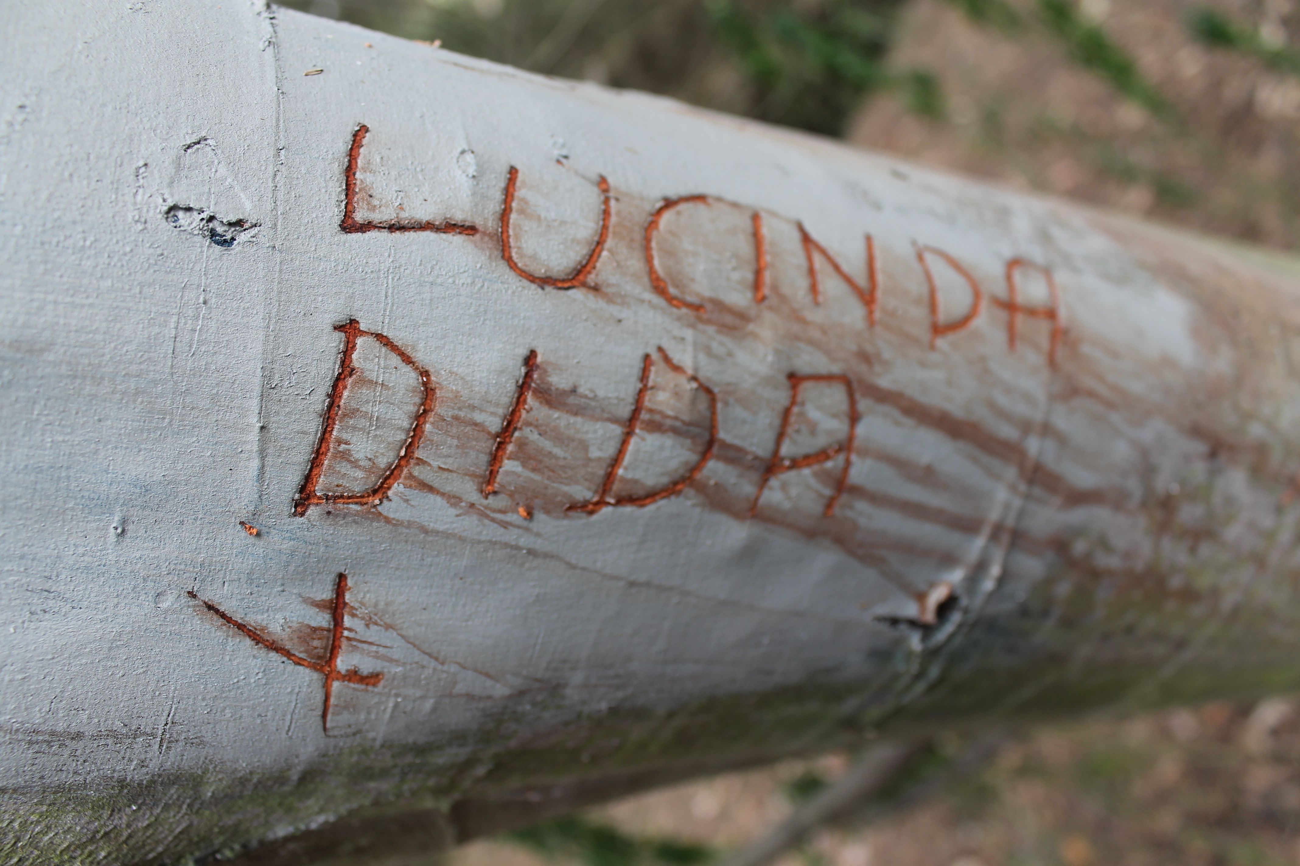I thought this was an interesting image. The carved letters had bled sap down the trunk, leaving sad trails over the paint.