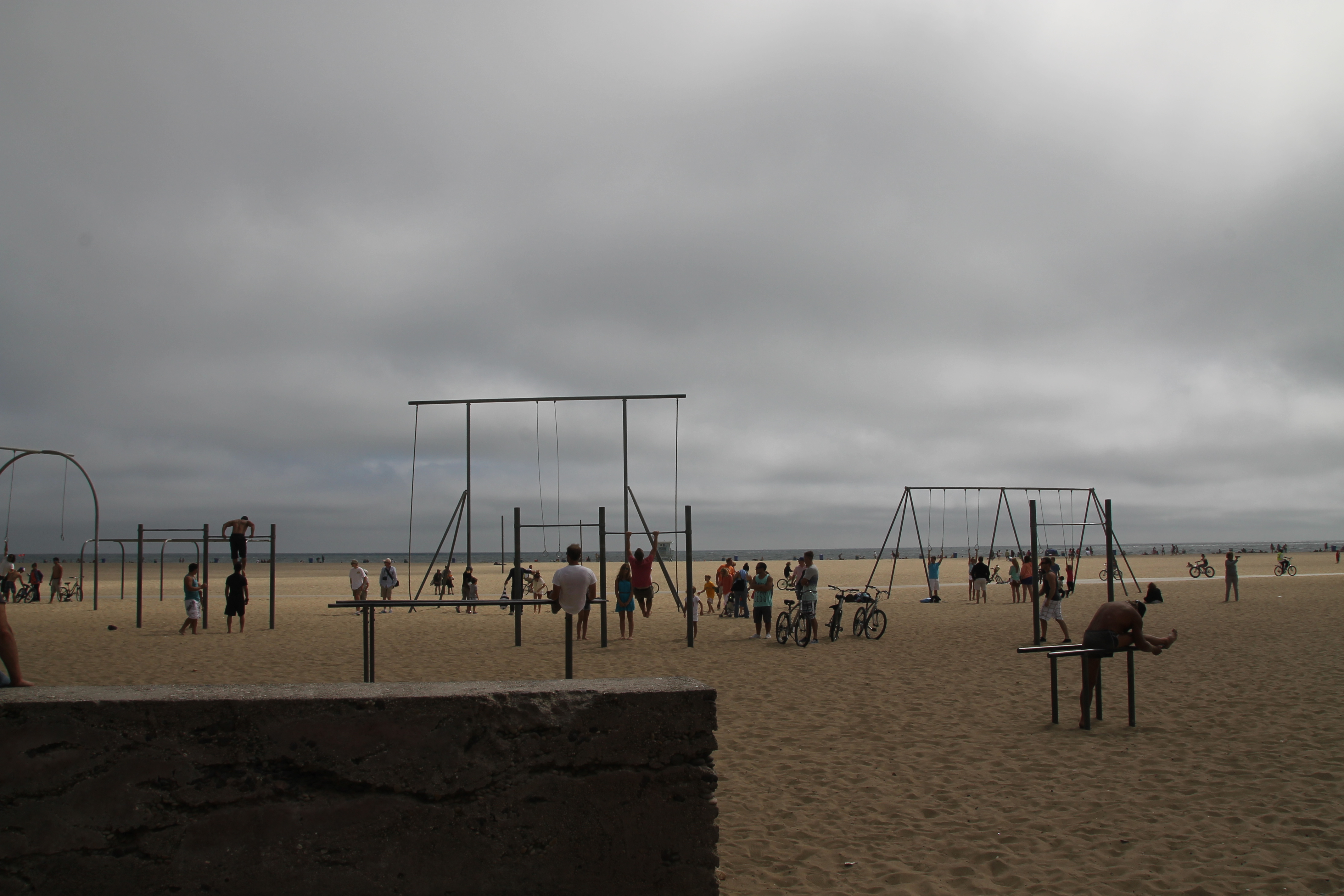 People working out at Muscle Beach in Los Angeles. In the bottom right of the shot you can see a guy stretching. He looked like he’d been coming there for years, he would have been about 60, he had skin like leather from too much sun, and just before I could get the camera out he’d been doing handstands on those bars. It was very impressive.