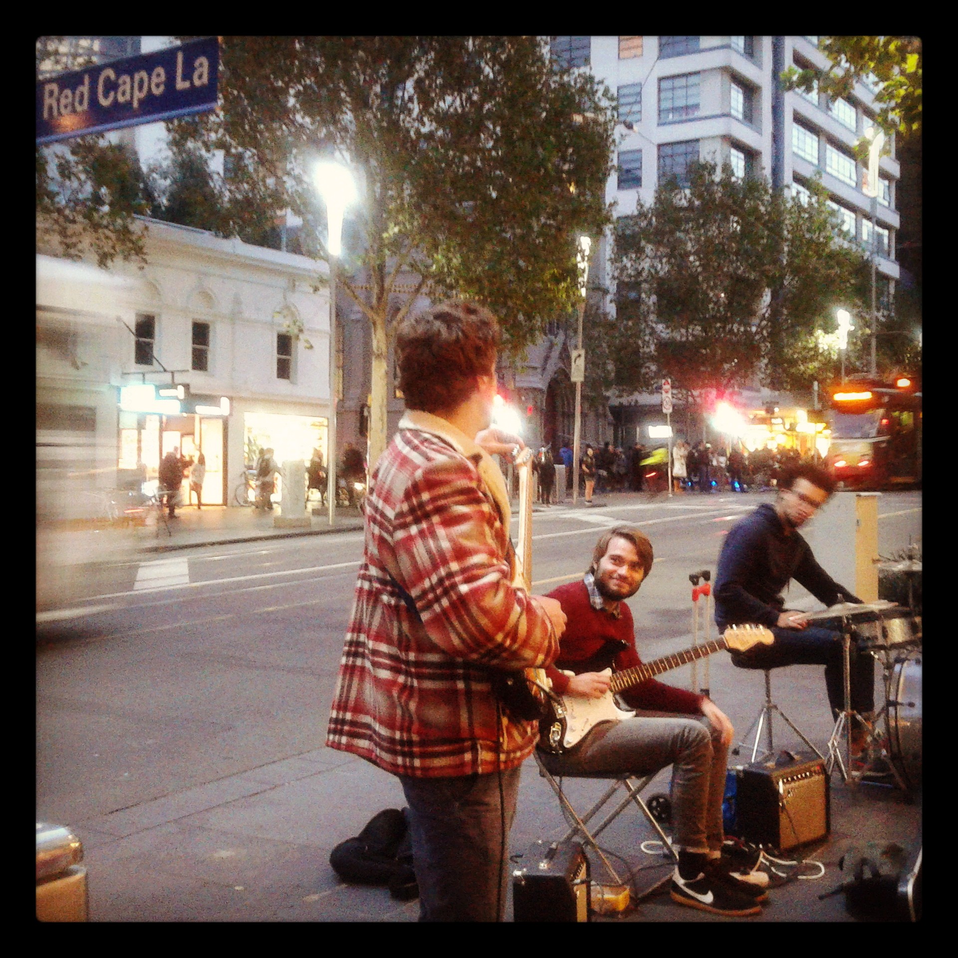 Day 1 – JournalDay 2 – snack; an apple and a feijoaDay 3 – A collection of cheeses for dinner last night, and I didn’t even have cheese dreams!Day 4 – From all of us here at Rod Laver Arena to see Michael Buble thank you for coming out and caressing us with your caramel vocals. So good!Day 5 – I missed 4pm today because I was staring into the black hole of complete disengagement from my work…Day 6 – from down below, this was an attempt to take a picture of the inside of the State Theatre in Melbourne, I thought it was arty.Day 7 – today’s prompt was taken from above, I found this abandoned scrap of knitting in the Ming Wing at Monash University, I thought it was sad.Day 8 – the theme today was blue, inspired by the blue Melbourne street sign I snapped these buskers, when I asked what their band was called the said they didn’t have a name.