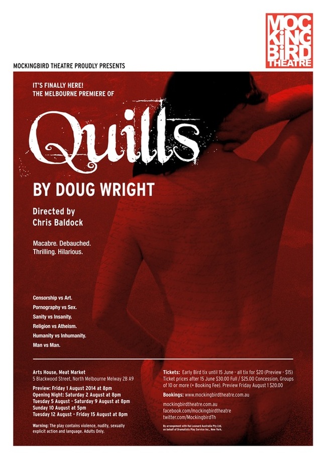 On Friday night I took myself to see a production of ‘Quills’, by Doug Wright, performed by Mockingbird Theatre. Some of you may know that ‘Quills’ was made into a movie with Geoffrey Rush in 2000, which is an excellent film and I would encourage you all to see it at some point.