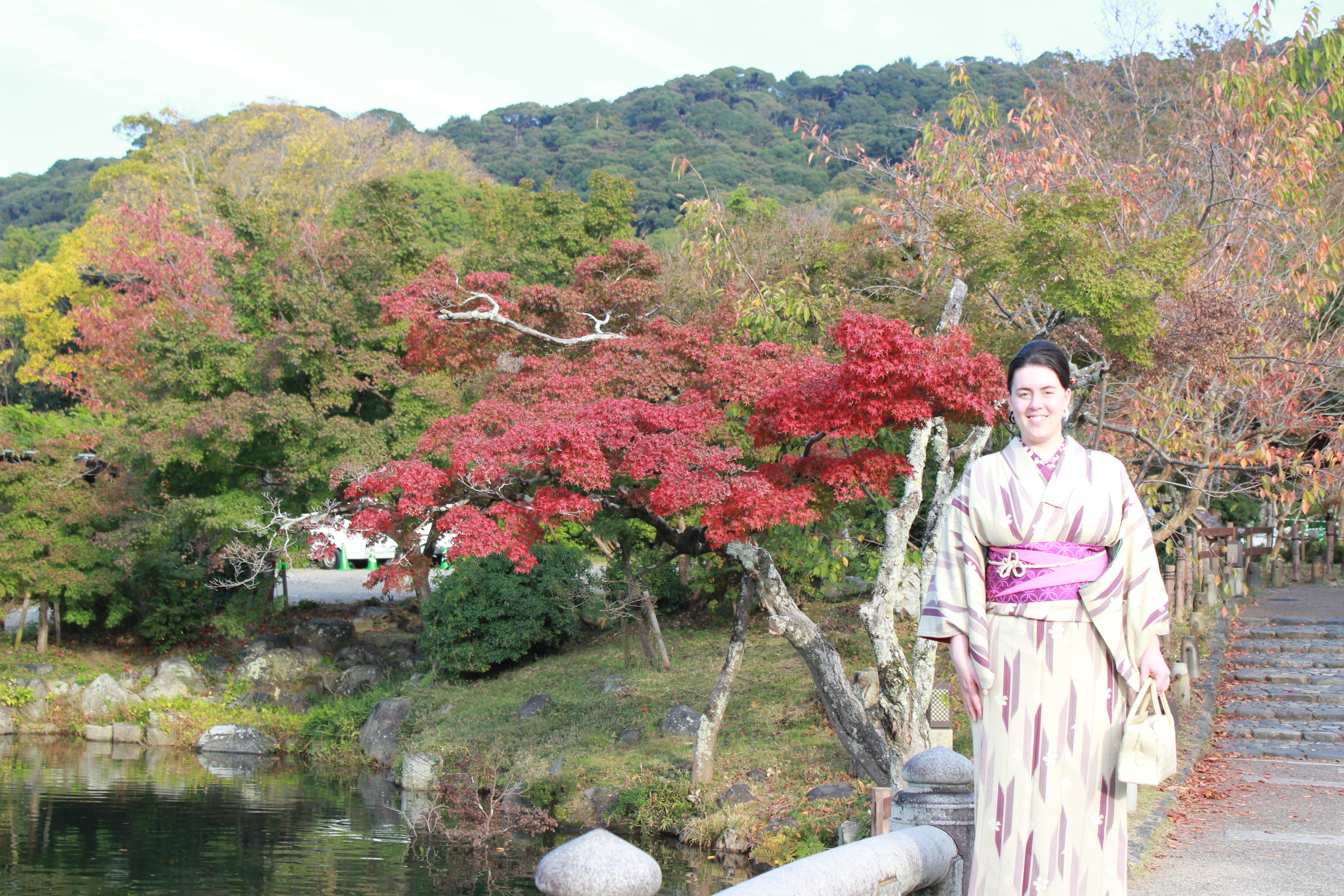 A white woman wearing traditional Japanese kimono stands in front of a lake, tree with striking red foliage, and a mountain in the background. Kyoto, Japan.